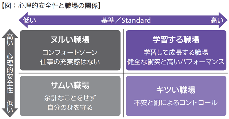 ここで、図左上の「ヌルい職場」を見てみましょう。ヌルい職場というのは、心理的安全性は高いけれども仕事の基準は低い職場のことです。この職場が「ヌルい」のは、心理的安全性が悪さをしているわけではありません。