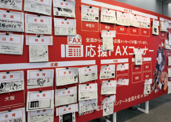 ▲会場には代表選手への応援ファクスが続々と届き、貼り出されました。