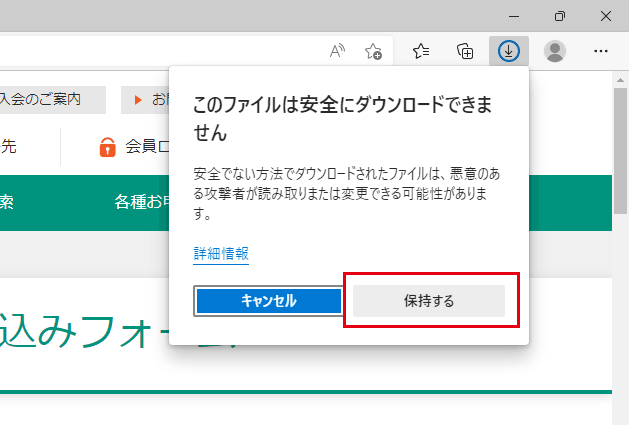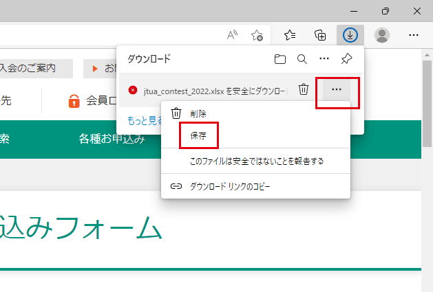 - 画面右上のより、「安全にダウンロードすることはできません」という表示にカーソルを合わせると表示される「・・・」ボタンより、「保存」を選択してください。