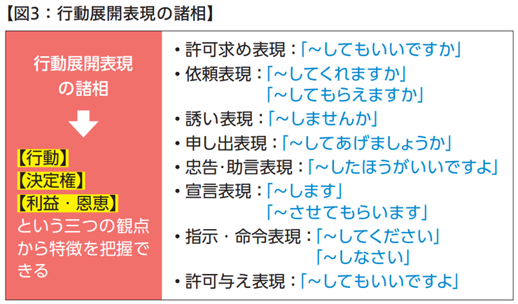 続いて、電話応対の中で丁寧さや感じのよさをどのように実現させていくのかに話題は移ります。蒲谷教授ほかの共著『敬語表現』では、伝える側がどのような意図を持ってコミュニケーションを取るかに注目し、①自己表出表現、②理解要請表現、③行動展開表現の三つの表現行為に分けられる、としています。そして、電話応対で多くみられるのが「行動展開表現」だと言います(図2)。さらに行動展開表現を行動、決定権、利益・恩恵の三つの観点から分類し、「~してもいいですか」のように相手に許可を求める言い方を「許可求め表現」、「~してくれますか」「~してもらえますか」を「依頼表現」、「~しませんか」を「誘い表現」などに分けて把握することができるとしています(図3)。