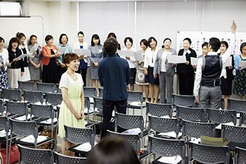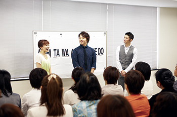授業の後半では、劇団四季のオリジナルミュージカル『ユタと不思議な仲間たち』のテーマソングである『友だちはいいもんだ』という歌を使って、美しい話し方を学びました。同劇団の方はいいます。「歌を歌うことは語りかけることです。歌詞の意味をまずはしっかり理解することが大切です」と。いきなり歌うのではなく、歌詞を全員で読むことからスタート。歌も話し言葉と同じように、キレイな言葉だと、より気持ちが伝わります。そのために、歌においても話す場合と同様に、母音を意識することが重要になります。まずは参加者全員で母音だけで歌ってみます。この時も心を込めることを忘れてはいけないといいます。次に、子音も入れて、全員で合唱。参加者の方が童心に返り、和やかな空気が充満する中、授業は終了となりました。同劇団の方を見送る、参加者の爽やかな笑顔が、その満足度を物語っているようでした。