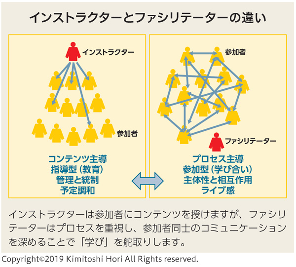 続いて堀氏は、インストラクターとファシリテーターの違いを分かりやすく紹介します。