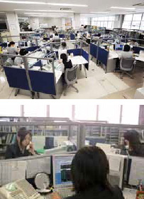 電話応対者のデスクはガラスの仕切りで、隣が見える。デスクには鏡が置かれ、笑顔で電話応対できているかどうかを自己チェックしている。