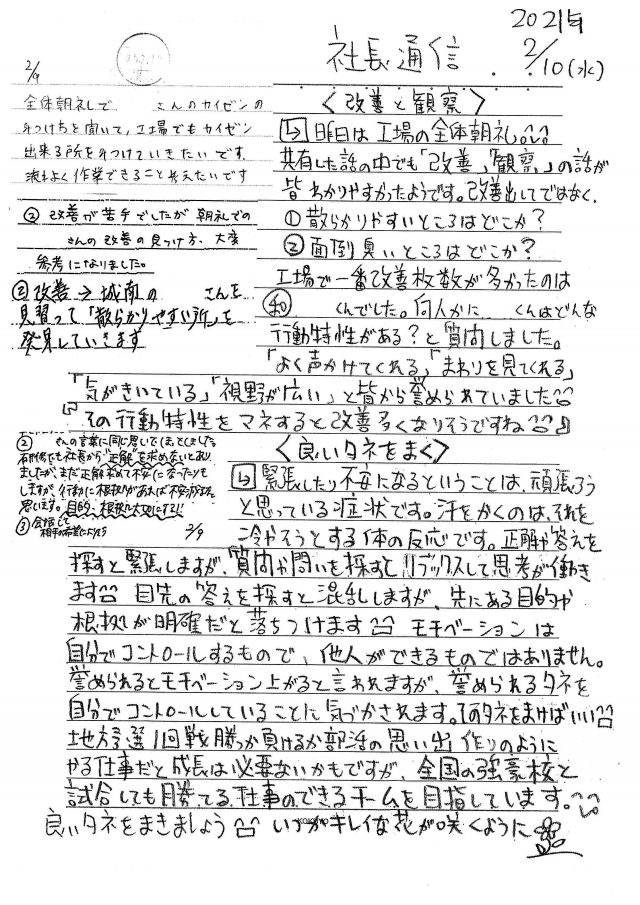 社員が提出する日報に対して、社長がコメントを返すという「社長通信」(右ページ参照)が、1年365日、お正月も休まず毎日配信されます。それによって、太郎庵での大切な価値観や理念、行動基準を共有し、社員全員が分かるようになっています。レジの使い方など機能的なことはマニュアルで伝えることができますが、文化や価値観など情緒的なことはマニュアルにはできません。お客さまのお言葉や先輩たちの事例、背中を見て学ぶものだと思っています。社長通信は手書きで書かれており、ファクシミリで各店舗に配信されます。アナログですよね(笑)。社内の業務はチャットツールなどでやり取りもしているのですが、やはり手書きだと気持ちがよく伝わるような気がします。デジタル化で無駄を効率化することも重要だと思いますが、アナログの良さを大切にするところも太郎庵らしいと思っています。