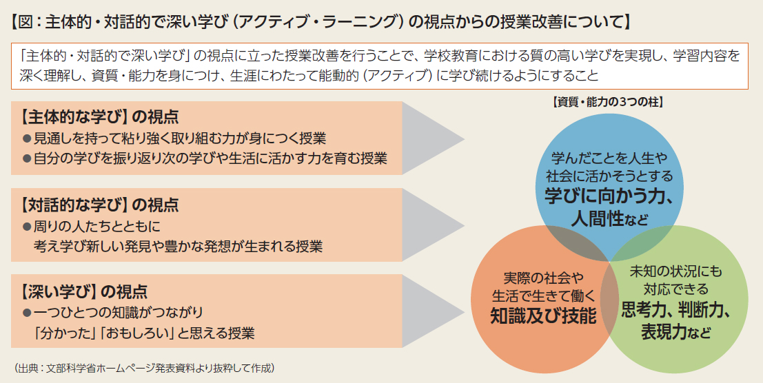 その新しい学習指導要領では、学校教育を通じて「学んだことを人生や社会に活かそうとする学びに向かう力、人間性など」、「実際の社会や生活で生きて働く知識及び技能」、「未知の状況にも対応できる思考力、判断力、表現力など」の3本の柱を偏りなく育んでいくことを目指していて、このような能力を育むための新しい学習方法として示されているのが、「主体的・対話的で深い学び(アクティブ・ラーニング)」です(図参照)。このような学びは、ICTを活用した学習方法が得意とする分野でもあります。