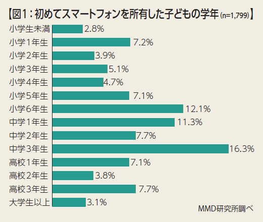 子どものスマホデビューは早まっています。MMD研究所が発表した調査(図1)によると、スマホデビューの時期は中学3年生が16.3%、小学6年生が12.1%と、進学をきっかけに持つことが多いことが分かります。そして学制別では、小学生でのデビューが40.1%と、もっとも多くなっています。