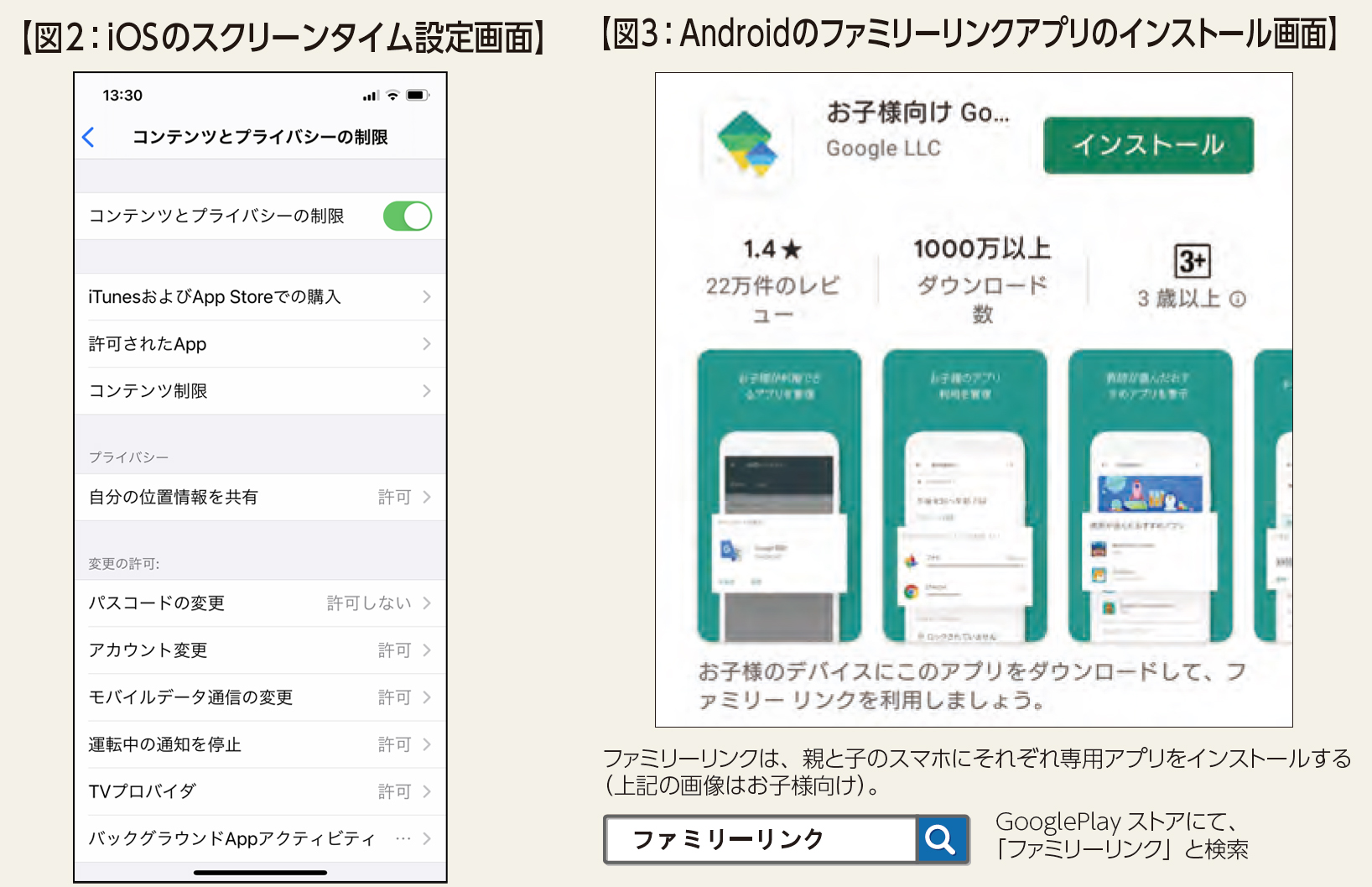 フィルタリングサービスのおすすめは、スクリーンタイム、もしくはファミリーリンクです。これらは家庭に合わせた設定が簡単で、無料で利用できるからです。例えば、深夜の利用を止める休止時間やアプリの利用時間の制限、不適切なコンテンツをブロックする機能、課金の禁止などを設定することができます。お子さんが利用する端末がiOSならスクリーンタイム(図2参照)の設定追加、Androidならファミリーリンクアプリ(図3参照)のインストールを行います。