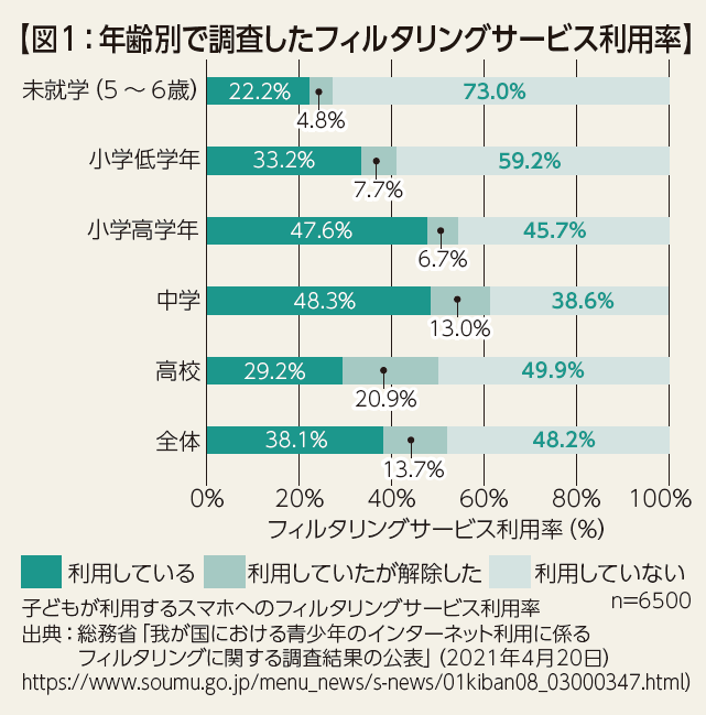 18歳未満がスマホを購入する場合、携帯電話会社はフィルタリングサービスについて説明を行い、設定をすることが法律で義務化されています。しかし、2021年(令和3年)4月20日に総務省が発表した「我が国における青少年のインターネット利用に係るフィルタリングに関する調査結果の公表」によると、スマートフォンを利用している青少年のフィルタリング利用率は38.1%に留まっています(図1参照)。