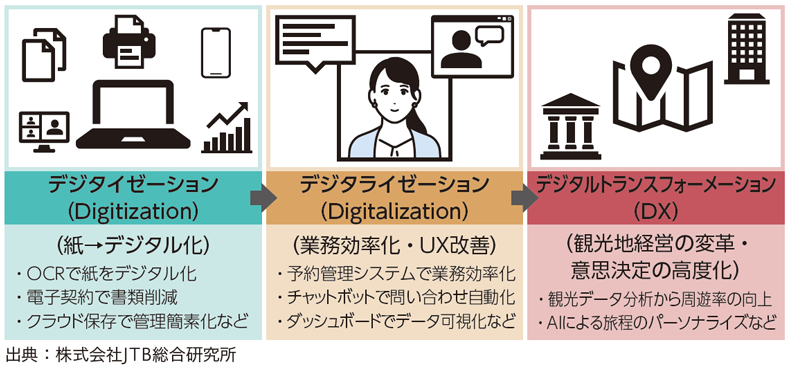 三輪氏:観光地におけるデジタル化は三つのプロセスに分けられます(図参照)。第一段階が「デジタイゼーション」で、紙の資料やアナログ業務をデジタルデータに置き換えることです。第二段階の「デジタライゼーション」は、そのデジタル技術を活用して業務効率を改善する段階で、例えば予約管理システムの導入などです。最後の第三段階「デジタルトランスフォーメーション(DX)」では、第二段階で得たデータをしっかり分析し、周遊率の向上を図ったり、AIによる旅程のパーソナライズなどを行います。この三つの段階において、日本の観光産業は第二段階で留まりやすい傾向があり、今後は短期的な効率化ではなく、中長期的な視点を持ちながら第三段階へ進んでいけると良いと考えています。