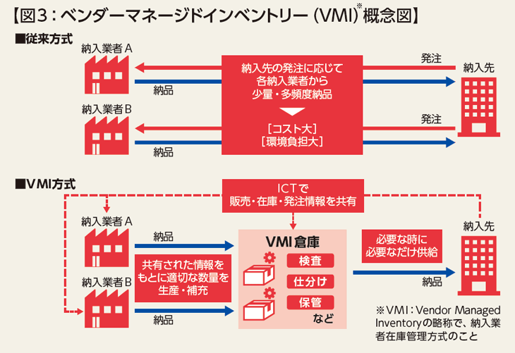 「スマートシティ、スマートカーなど、最近『スマート』という言葉をよく使いますが、モノのスマート化の本質は、人の判断より先にモノが動くことです。例えば、物流業界では、ベンダーマネージドインベントリー(VMI)という考え方があります(図3参照)。本来は、顧客がベンダー(納入業者)に製品などを発注しますが、VMIでは納入業者側で顧客の生産状況や売れ行きを把握して在庫を補充していきます。仮に、ニューヨークのデパートでセーターが欠品したら、顧客の指示を待たずに、中国の工場で増産が始まるといったような仕組みです。これは、ベンダーと顧客がICTで連携、情報を共有することで効率の良い在庫管理を実現した例ですが、このように各企業や組織が横断的にデータで連携するようになると、さまざまなビジネスシーンにおいて生産性を高められる仕組みが作られていくと思われます」(村上氏)