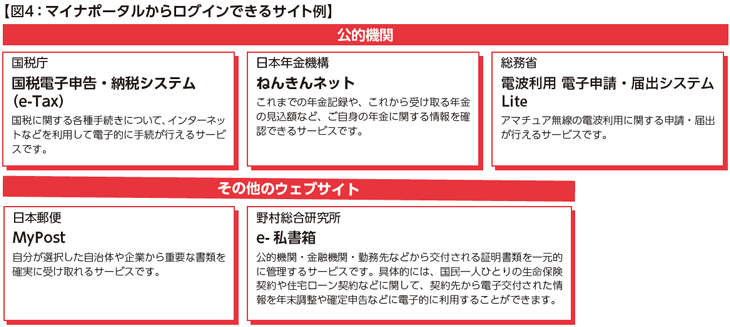 ほかにも、企業や個人事業主が主導して使いやすいシステムが生まれる施策として、「マイナポータルのAP(I Application ProgrammingInterface)提供・連携」もあります。API連携とは、アプリケーションなどの機能の一部を外部の事業者が利用できるようにすることで、複数のシステムで連携してサービスの提供ができるようにする仕組みです。マイナポータルのAPIを民間企業やほかの行政機関が使うことで、例えば、日本郵便が提供するインターネット上のポスト「MyPost」に届いたレターがマイナポータルの新着一覧に表示されたり、e-Tax(国税電子申告・納税システム)や「ねんきんネット」のサイトにマイナポータルからログインできるようになっています(図4参照)。