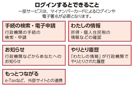 マイナポータルは、政府が運営するオンラインサービスで、自治体や保険者に照会して自分の医療保険の薬の情報や所得税・住民税の所得情報を取得することができます。また、子育てや介護などの手続きの検索やオンライン申請、行政からの連絡確認をワンストップで行うこともできます。中でも「手続の検索・電子申請(ぴったりサービス)」では、知りたい制度や手続きを検索したり、児童手当などの申請手続きを好きな時にパソコンやスマートフォンからできます。マイナポータルは、マイナンバーカードと電子証明書パスワードでログインすると、さまざまなサービスを利用できますが、一部のサービス(「手続の検索・電子申請」の手続検索や申請書のオンライン入力など)はマイナンバーカードがなくても利用可能です。