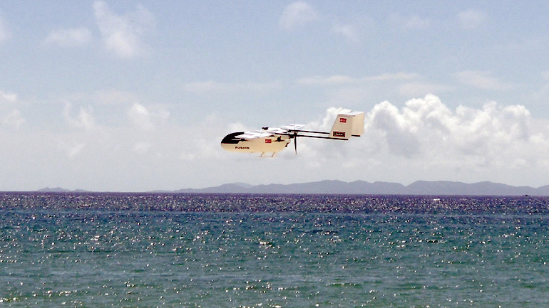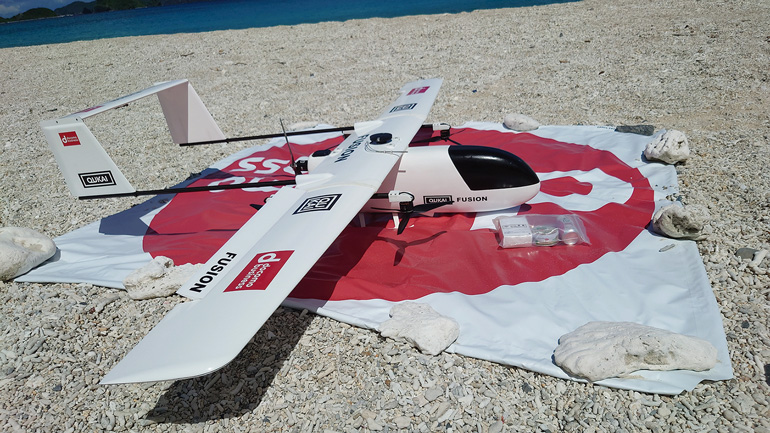 中でも昨年6月に沖縄県座間味村と豊見城市の協力により行われた、沖縄本島から座間味島へのドローン飛行による救援物資の運搬実証実験(写真①)では、これまで前例のない約40kmもの長距離の自律飛行と高精度な着陸を成功させ(写真②)、ドローン配送の可能性を大きく切り開きました」(小川氏)