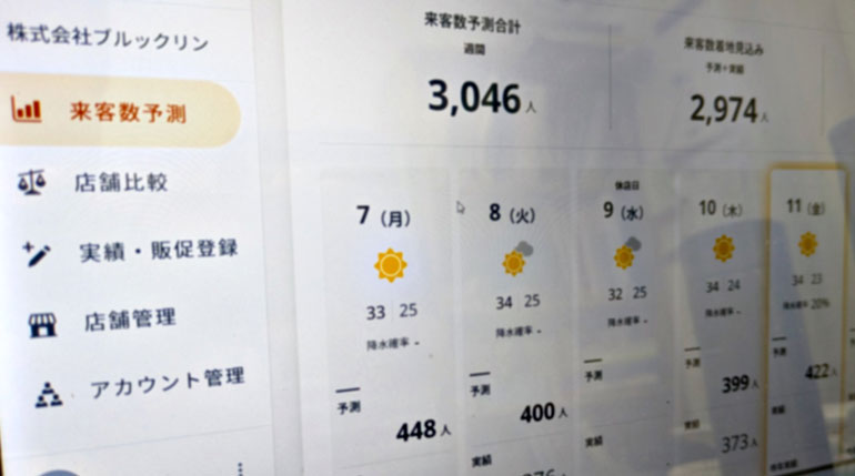 同店が現在使用しているAI需要予測システムは、サービスを提供している通信会社と日本気象協会が共同開発したもので、通信会社の携帯電話基地局から得られる端末の位置情報データを基にした人流統計データや、日本気象協会が保有する気象データ、利用企業の店舗ごとの売上や来店客数など各種データをAIアルゴリズムで分析し、需要を予測するサービスです。月額8,000円ほどで利用でき、予測は毎日朝9時に更新されます。