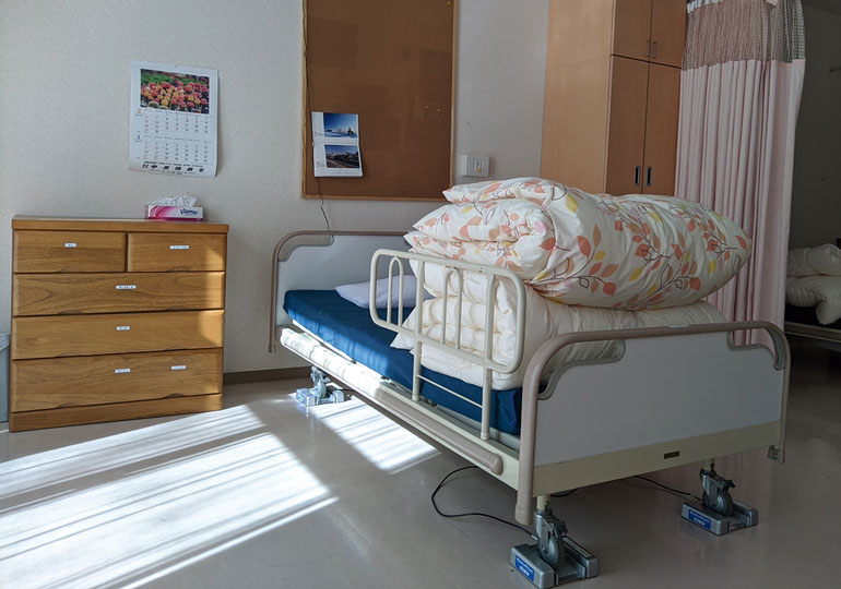 特養では、自立が難しい利用者の転倒や転落事故を未然に防ぐため、身体の動きをセンサーで感知して介護スタッフに通知する、「見守り型ベッド」の導入も進んでいます。以前に導入していたマット型センサーは、人がベッドから起き上がり床に足をつけてから動きを感知するため、職員が訪室した時にはすでに転倒していたなどの問題がありました。しかし、新しく導入した見守り型ベッドは寝返りなど離床前の動きを感知して通知するため、事故などを防ぎやすくなったと言います。