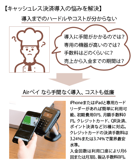 「Airペイ」は、クレジットカード・電子マネー・QRコード・ポイントに対応する決済サービスです。iPadまたはiPhoneと専用カードリーダーが1台あれば、全35種の決済手段に対応し、お店のキャッシュレス化が実現します。