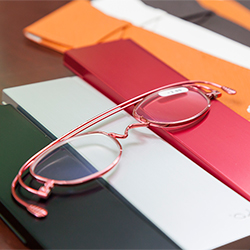 西村氏のみならず、一家そろってチャレンジ精神旺盛であることを示すものに、2003年の「ペーパーグラス」の開発があります。畳むと厚みがわずか2ミリという老眼鏡で、おしゃれなケースも添えられています。この画期的なデザインは、会長の忠憲氏がフレームとレンズをつなぐ構造を考え、社長の憲治氏がしなやかなカーブのステンレスフレームを作り、全体のプロモーションは西村プレシジョンの昭宏氏が行うという、一家での役割分担から実現しました。また、研磨技術を活用して開発した100%チタン製の「逆さコマ」も、「ペーパーグラス」とともにメディアで取り上げられました。