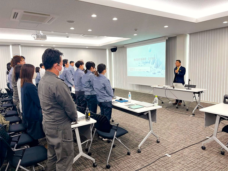 同社は2019年6月よりDXに取り組みましたが、デジタル分野の専門職の採用やDX推進チームのような固定した部門の設置などは行わず、従業員全員がDXに取り組む「全員DX」の方針を掲げました。